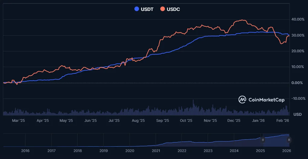 بر اساس گزارش رسانههای ارز دیجیتال کوین تلگراف، ارزش بازار تتر در سه ماهه چهارم سال 2025 به رکورد 187.3 میلیارد دلار رسید که با وجود رکود گسترده در بازار ارزهای دیجیتال پس از موج انحلال اکتبر، 12.4 میلیارد دلار رشد کرد. در همین حال، استیبل کوین های رقیب عملکرد ضعیف تری داشتند. استیبل کوین USDC Circle تقریباً بدون تغییر باقی ماند و USDe پروژه Athena حدود 57٪ از ارزش خود را از دست داد.